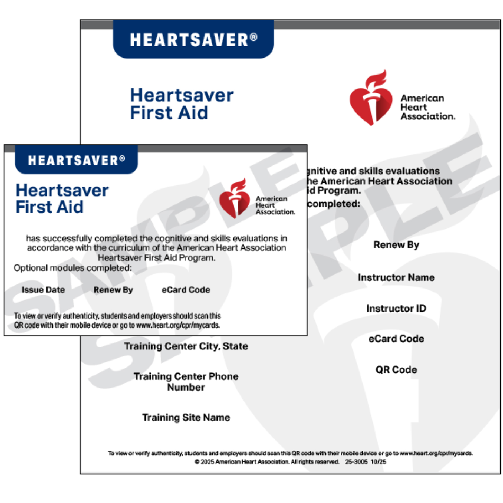 All instructors are certified by the American Heart Association, and the course follows the most current 2025 guidelines. You receive an AHA Heartsaver® First Aid eCard after successful completion.